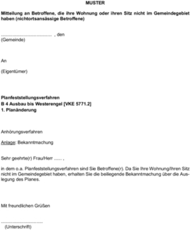| 6. | Über die Einwendungen und Stellungnahmen wird nach Abschluss des Anhörungsverfahrens durch die Planfeststellungsbehörde entschieden. Die Zustellung der Entscheidung (Planfeststellungsbeschluss) an die Einwender und diejenigen, die eine Stellungnahme abgegeben haben kann durch öffentliche Bekanntmachung ersetzt werden, wenn mehr als 50 Zustellungen vorzunehmen sind. | |