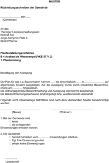 | Nach Ablauf der Einwendungsfrist sind Einwendungen ausgeschlossen (§ 73 Abs. 4 S. 3 ThürVwVfG). Einwendungen und Stellungnahmen der Vereinigungen sind nach Ablauf dieser Frist ebenfalls ausgeschlossen (§ 73 Abs. 4 S. 3 ThürVwVfG). | |