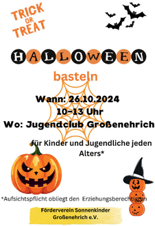 Der Förderverein Sonnenkinder Großenehrich e.V. läd zum Halloween Basteln ein. Das Kreativangebot ist für alle Kinder und Jugendliche kostenfrei.