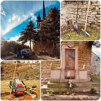 Durch fleißige Hände, Einsatz von Maschinen, Heckenschere, Haken und Besen erzielten wir am Denkmal der gefallenen Soldaten aus dem 1. und 2. Weltkrieg sowie dem Weg zur Kirche ein gepflegtes Erscheinungsbild.