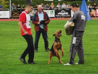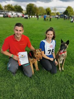 Am letzten Wochenende fanden die Deutschen Meisterschaften im Schutzhundesport im Verband für das Deutsche Hundewesen (VDH) in Hechingen - Baden-Württemberg statt. Zu dieser Meisterschaft starten die Besten der Rassehunde- und Hundesportverbände. In diesem Jahr nahmen 76 Hunde der Rassen Malinois, Deutscher Schäferhund, Airedale Terrier, Boxer, Riesenschnauzer, Rottweiler, Hovawart, Dobermann und Bouvier teil und kämpften um die begehrten 4 Startplätze für das Nationalteam zur Weltmeisterschaft. Diese Rassevielfalt macht die Veranstaltung für Zuschauer besonders interessant und wird durch die Hundeplattform Working Dog per Livestream in die ganze Welt übertragen. Mit Timo Witters und seiner Freundin Lara Michelle Schäfer konnten sich gleich 2 Greußener Hundesportler für den Wettkampf qualifizieren. Lara erreichte mit ihrer Malinoishündin Bree Bonfire von Zamonien 84 Punkte in der Fährte, 87 P. in der Unterordnung und 73 P. im Schutzdienst. Damit konnte sie die Prüfung erfolgreich bestehen und ist damit zur Deutschen Hundesportmeisterschaft im dhv bereits qualifiziert. Für Timo lief es mit seinem Airedale Terrier Antrax von Anna Maria von Anfang an wie am Schnürchen. In der Fährte und im Schutzdienst erhielten beide mit jeweils 96 Punkten eine vorzügliche Bewertung. Ein Blick auf die Tabelle ließ erhoffen, es ist einiges möglich. Was dann aber am letzten Wettkampftag geschah, hätte im Vorfeld keiner für möglich gehalten. In der Unterordnung erhielt das Team mit 91 P. eine sehr gute Bewertung und kletterten auf den 4. Platz. Die Zuschauer im Stadion waren begeistert. Es fehlte nur 1 Punkt auf das Podest, aber der Platz im deutschem Nationalteam und ein Start zur Weltmeisterschaft in Nora Gorica/ Slowenien im September sind ihm sicher. Somit überwiegte die Freude und die Gratulationen nahmen kein Ende. Wir wünschen beiden für die nächsten Wettkämpfe viel Erfolg! Der letzte Höhepunkt sind dann die Deutschen Meisterschaften im Klub für Terrier, die in diesem Jahr Ende September in Greußen stattfinden.