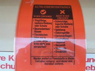 Bitte nutzen Sie diese Altkleidercontainer ausschließlich zur Abgabe tragbarer Kleidung, Schuhe (paarweise gebündelt), Textilien und Heimtextilien.