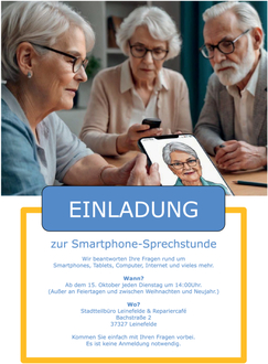 | Was: | Smartphone-Sprechstunde für Senioren und alle anderen, die Fragen zur Bedienung und Nutzung von ihrem Handy, Tablet oder Computer haben. |