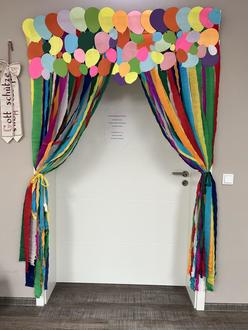 Türvorhang aus vielen bunten Luftballons gestaltet.