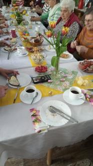 So war es auch am Mittwoch vor Ostern. Um 9.30 Uhr waren alle Plätze im Raum besetzt. Nach der Begrüßung bewunderten alle die österlich geschmückte Tafel. Da passte aber auch alles,von den Frühlingsblumen, den Servietten bis zu den Schokoladenhasen und Ostereiern.