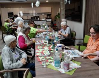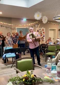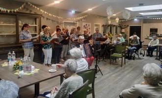 In der nächsten Woche ging es dann gleich weiter. Wir bastelten für unsere kleinen Gäste aus dem Kindergarten schöne Erdbeerpräsente für unser Sommerfest. Diese konnten sie sich nach ihrem super Auftritt, mit Liedern von Rolf Zuckowski und Roy Black mit nach Hause nehmen. Unsere Klientin Frau Voss trug ein schönes Sommergedicht vor, der Ober versuchte seinem Gast das Essen in einem Sketch schmackhaft zu machen. Auch Adele und Adelchen gaben ihr Können zum Besten. Nun gab es lecker Sommerbowle, selbstgemachten Salat und Bratwurst für die Geschmacksnerven. Nach einer kurzen Ruhepause, ging es am Nachmittag mit dem Besuch vom Chor „La musica“ weiter. Sie trugen schöne Sommerlieder wie „Die Vogelhochzeit für Erwachsene“, das Lied in dem in 4 Minuten 60 verschiedene Lieder gesungen werden und den Sketch „die Eheleute“ vor. Zum krönenden Abschluss, wurde ein Stück auf dem Dudelsack gespielt. Jetzt gab es leckeren selbstgebackenen Kuchen zum Kaffee und dann ging es glücklich und zufrieden nach Hause.