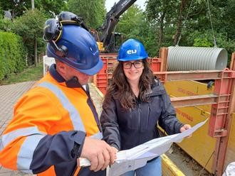 Koordiniert die Kanalbauarbeiten für die Eichsfeldwerke: Ingenieurin Melissa Nolte im Gespräch mit dem Polier der Firma Universalbau, Tommy Schnitter