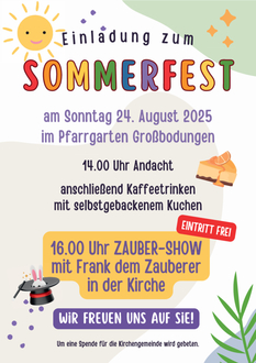 | 14.00 Uhr | Pfarrgarten Großbodungen | Andacht zum Sommerfest |
