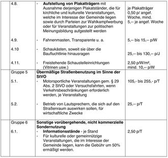 Die Mindestgebühr für die Erlaubnis von Sondernutzungen beträgt 5,50 EURO, sofern der Gebührentarif keine anderen Mindestgebühren vorsieht.