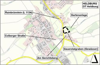 Das Plangebiet liegt im Ortsteil Heldburg. Der Geltungsbereich wird im Westen von der Straße „Rainbrünnlein“ (L 1134) und im Süden vom Gewässer „Gauerstalgraben“ begrenzt. Südlich des Gewässers befindet sich die Straße „Am Gerichtsberg“. Im Osten schließt sich eine Gartenanlage an das Plangebiet an. Im Norden befindet sich die Zuwegung zur Gartenanlage, welche hier den Abschluss bildet. Der Geltungsbereich des vorhabenbezogenen Bebauungsplans Sondergebiet Handel „Neubau eines Lebensmittelmarktes Edeka in der Straße Rainbrünnlein“ ist dem Übersichtslageplan zu entnehmen. Er umfasst in der Gemarkung Heldburg, Flur 0, die Flurstücke 4177 (teilweise; Straße), 4182 und 4183.