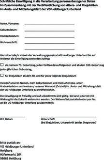 Wir fänden es sehr schade, wenn diese Tradition wegfällt. Aus diesem Grund bieten wir Ihnen folgende Lösung an: Wenn Sie zur entsprechenden Altersgruppe gehören und den Wunsch haben, dass künftig Ihre Geburtstage ab dem 70. Lebensjahr und/oder Ihre Ehejubiläen ab der Goldenen Hochzeit (50 Ehejahre) veröffentlicht werden sollen, so teilen Sie uns bitte Ihren Ehrentag selbst mit, in dem Sie die nachfolgende Einwilligungserklärung (siehe Formblatt) vollständig ausfüllen und an uns zurücksenden.