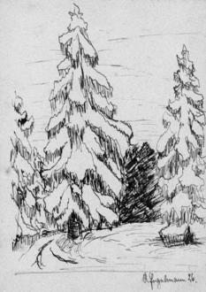 Verschneite Tannen, Federzeichnung von Kurt Engelmann, 1926 Kunstsammlung des Regionalmuseums