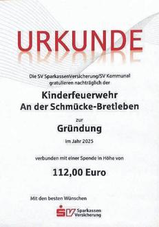 Verbunden war diese Anerkennung mit einer Spende in Höhe von 112 Euro, die dem Feuerwehrverein Bretleben für die Jugendarbeit überreicht wurde. Die übergebene Urkunde unterstreicht die Wertschätzung für das ehrenamtliche Engagement und die wichtige Nachwuchsarbeit vor Ort. Zusätzlich stattete der Feuerwehrverein die Kinder mit neuen Ausrüstungsgegenständen aus. Jedes Mitglied erhielt ein Basecap, ein Sweatshirt sowie eine Wintermütze. Als nachträgliches Weihnachtsgeschenk gab es außerdem eine Tüte Süßigkeiten, die bei den jungen Feuerwehrmitgliedern für große Freude sorgte.
