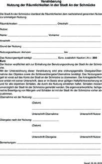 Jeder Nutzer trägt die Verantwortung für die ordnungsgemäße Nutzung des Objektes. Die Durchführung einer ordnungsgemäßen Übergabe/Übernahme mit dem Nutzer obliegt der Stadt.