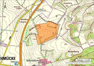 Der aktuelle räumliche Geltungsbereich des Bebauungsplanes aus dem Jahr 2004 ist aus der mitveröffentlichten Planskizze ersichtlich. Er umfasst eine Fläche von rund 47 ha und liegt etwa 500 m nördlich der Ortschaft Braunsroda in der Gemarkung Heldrungen