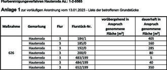| 1. | Auf der Grundlage des vom Thüringer Landesamtes für Bodenmanagement und Geoinformation, Flurbereinigungsbereich Gotha, (ehemals Amt für Landentwicklung und Flurneuordnung Gotha) im Benehmen mit dem Vorstand der Teilnehmergemeinschaft (TG) der Flurbereinigung Hauteroda erstellten und mit Datum vom 18.10.2012 genehmigten Wege- und Gewässerplanes mit landschaftspflegerischem Begleitplan nach § 41 FlurbG (Plan nach § 41 FlurbG) sowie der am 11.11.2022 genehmigten 3. Änderung zum Wege und Gewässerplan, werden den bisher Berechtigten die Nutzung und der Besitz der, in der Anlage 1 aufgeführten, Grundstücke bzw. Teile der Grundstücke für den Bau gemeinschaftlicher Anlagen entzogen. Die Teilnehmergemeinschaft (TG) der Flurbereinigung Hauteroda, vertreten durch den Verband für Landentwicklung und Flurneuordnung Thüringen (VLF), wird mit Wirkung vom | |