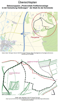 Der Vorentwurf des Bebauungsplanes „Photovoltaik-Freiflächenanlage in der Gemarkung Heldrungen“ der Stadt An der Schmücke, bestehend aus der Planzeichnung, der Begründung sowie dem Umweltbericht mit Grünordnungsplan, Artenschutzfachbeitrag und NATURA 2000 Erheblichkeitseinschätzung wird gemäß § 3 (1) BauGB zur frühzeitigen Öffentlichkeitsbeteiligung im Zeitraum