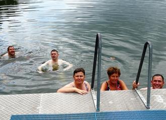 Dann endlich ging es ins Wasser. Das offizielle Anbaden führten natürlich auch Maik Balthasar und Stephan Schenk an, gefolgt von Frau Schäffer, Sören Schobeß, dem Vorsitzenden der DLRG Kyffhäuser und Frau Karin Holzapfel, einer aktiven Mitgestalterin des neuen alten Bades.