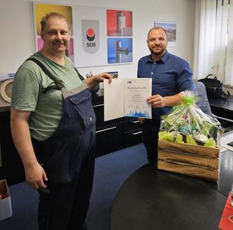 Zu diesem Anlass erhielt Herr Witt (links im Bild) vom SEM Betriebsleiter David Dietrich (rechts im Bild) unter großem Respekt und Anerkennung, eine Ehrenurkunde sowie ein Präsent.