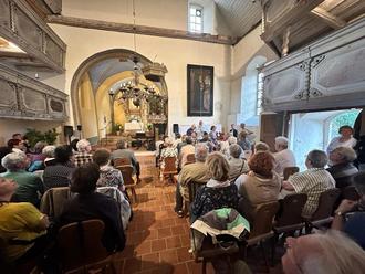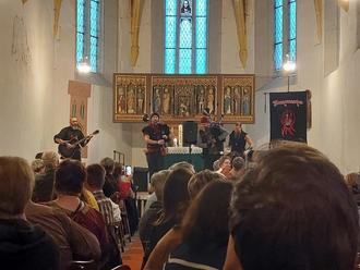 Der Posaunenchor aus Oldisleben spielte zum Ausgang unter freiem Himmel. Und so konnten die Besucher*innen mit wunderbaren Klängen aufbrechen. Zum Mittag gab es von der Gemeinde organisiert Erbsensuppe von Herrn Lutze und seinem Team. Es gab leckere Kuchen und Deftiges vom Grill. Im Anschluss wurde das offene Atelier von Bildhauer Timm Kregel durch ein Gartenkonzert von Liedermacherin Friederike Teichert eröffnet. Dann gewährte Timm Kregel Einblicke in sein Schaffen. Er arbeitet im Moment an dem Projekt „Ein Dürer für Mühlhausen“ im Rahmen des 500. Bauernkriegsgedenkens. 2025 wird es dazu auch Veranstaltungen im Kirchenkreis Eisleben-Sömmerda in den Thomas Müntzer Wirkorten Stollberg, Allstedt und auf der Wasserburg Heldrungen geben. Den Höhepunkt des Abends am Sonntag, den 2.6.24, bildete das Festkonzert: Sethus Calvisius - Klangwelt um 1600 in der St. Bonifatiuskirche in Gorsleben. Viele Menschen sind noch kurz entschlossen gekommen. So war die Kirche bis auf den letzten Platz gefüllt. Die Besucher*innen konnten das Ensemble „amarcord“ in besonderem Ambiente genießen.