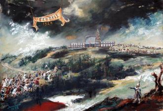 Es verbindet ihn dadurch sehr viel mit der Geschichte um den Theologen Thomas Müntzer. Genug Hintergrundwissen und eigenes Erleben, um sich im hohen Lebensalter auf graphische und malerische Weise den einstigen Wirkungsstätten und regionalen Ereignisorten des Bauernkrieges zuzuwenden.