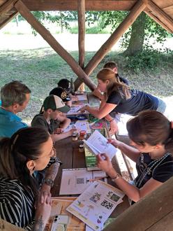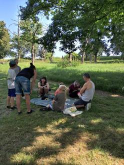Hier konnte man sich mit Schmetterlingen, Ameisen, Libellen usw. verschönern lassen. Großer Andrang war bei einer kleinen Exkursion über die Obststreuwiese. Hier wurden Insekten gesammelt und bestimmt. Natürlich anschließend wieder in die Freiheit entlassen.