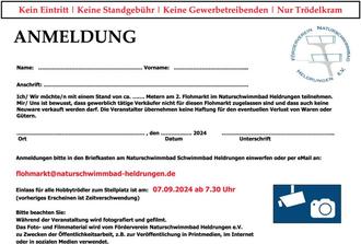 Ihren Standplatz bekommen sie am Samstag, den 07.09.2024 ab 7.30 Uhr direkt von den Ordnern zugewiesen. Treffpunkt ist der frühere Haupteingang. Parken können Sie auf dem gegenüberliegenden, großzügigen Parkplatz und zum Ausladen können Sie in Absprache mit den Ordnern den Eingangsbereich des Schwimmbades kurzzeitig nutzen.