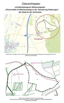 Der Entwurf des vorhabenbezogenen Bebauungsplanes „Photovoltaik-Freiflächenanlage in der Gemarkung Heldrungen“ der Stadt An der Schmücke, bestehend aus der Planzeichnung, der Begründung sowie dem Umweltbericht mit Grünordnungsplan, Artenschutzfachbeitrag und NATURA 2000 Erheblichkeitseinschätzung wird gemäß § 3 (2) BauGB zur Öffentlichkeitsbeteiligung im Zeitraum