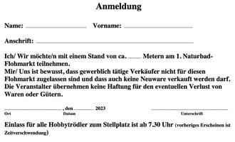 Anmeldungen können ab dem 15.09.23 per Mail unter flohmarkt@naturschwimmbad-heldrungen.de oder per Einwurf des Anmeldezettels in den extra dafür montierten Briefkasten direkt am Eingang des Naturschwimmbades, Oldislebener Weg 22 erfolgen.