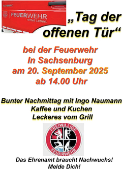 Die Kameraden der Freiwilligen Feuerwehr und die Mitglieder des Feuerwehrvereines laden Sie ganz herzlich ab 14.00 Uhr ins Gerätehaus zum „Tag der offenen Tür“ ein.