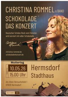 Am Sonntag, den 10. Mai 2026, um 15:00 Uhr, öffnet das Stadthaus Hermsdorf seine Türen für ein Konzerterlebnis der ganz besonderen Art. Die Ausnahme-Musikerin Christina Rommel lädt ein zu „Schokolade - Das Konzert“ - einer sinnlichen Verbindung aus Musik, Genuss und Emotion.