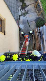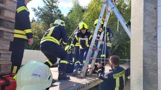Nach dieser schweißtreibenden Aufgabe bei herrlichem Spätsommerwetter währte die Verschnaufpause nur kurz. Um 15.15 Uhr ging die Sirene und rief damit zur gemeinsamen Abschlussübung. Angenommen wurde ein Brand bei der Zimmerei Bräuner im Gewerbegebiet mit vermissten Personen im verrauchten Gebäude. Für die realistische Darstellung kam die Jugendfeuerwehr Reichenbach zum Einsatz, die sich im Gebäude suchen und retten ließ.