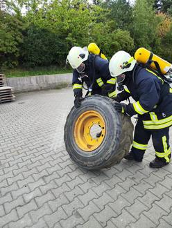Pünktlich um 12 Uhr stand im Sportlerheim eine Stärkung mit Erbsensuppe auf dem Programm. Die war auch notwendig, um dann ein weiteres Mal Station bei MT-Transport zu machen und beim „Atemschutzbelastungstraining“ an die persönlichen Grenzen zu gehen. Mit Atemschutzmaske und dem schweren Druckluftflaschen auf dem Rücken musste ein Parcours mit verschiedenen Aufgaben, u.a. Transport von Menschen auf Trage, Bewegen von schweren Lasten etc. bewältigt werden.