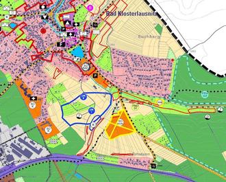 Ausschnitt des genehmigten gemeinsamen Flächennutzungsplanes Hermsdorf - Bad Klosterlausnitz / Gemeinde Bad Klosterlausnitz mit Markierung des von der Genehmigung ausgenommenen räumlichen Teilbereichs.