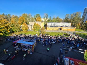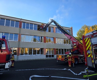 Es ist der 16.Oktober gegen 10.00 Uhr. Rauchschwaden steigen aus einem Fenster im 2. Stockwerk der Schule auf. Die Ursache ist noch unbekannt. Kurz darauf löst der Schulleiter, Herr Maier Alarm aus und setzt gleichzeitig einen Notruf ab. Während alle Schüler auf kürzestem Fluchtweg das Gebäude verlassen, verbleiben die Schüler der Klassen 5c und 6b sehr diszipliniert in ihren Räumen, denn ihr Fluchtweg ist wegen des Nebels unpassierbar. Gemeinsam mit ihren Fachlehrern warten sie auf Hilfe. Nach bereits acht Minuten steht das ersten Fahrzeug der Hermsdorfer Feuerwehr auf dem Schulhof. Ein Streifenwagen der Polizei sichert die Zufahrtswege. Es folgten weitere Einsatzfahrzeuge der Feuerwehr und zwei Schüler werden nun über die Drehleiter evakuiert und die eingesetzte Nebelmaschine wird schnell als die vermeintliche „Brandursache“ identifiziert.