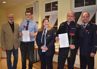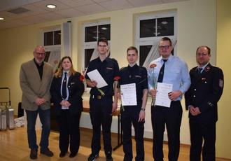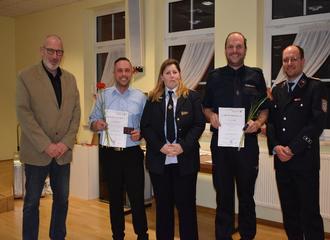 1. Beigeordneter Uwe Kirchner; Feuerwehrmannanwärter Lukas Leidenfrost; stellv. Ortsbrandmeisterin Andrea Naumann; Hauptfeuerwehrmann Mathias Schmidt; Ortsbrandmeister Felix Graumüller (v. l. n. r.)
