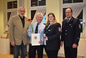 1. Beigeordneter Uwe Kirchner; Kamerad Kurt Pohle; stellv. Ortsbrandmeisterin Andrea Naumann; Ortsbrandmeister Felix Graumüller (v. l. n. r.)
