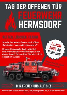 Somit laden wir alle Bürgerinnen und Bürger der Stadt Hermsdorf und Umgebung recht herzlich am 21.06.2025 zum alljährlichen Tag der offenen Tür der Feuerwehr Stadt Hermsdorf ein.