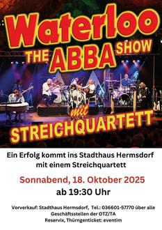 Erleben Sie ein unvergessliches Konzert: Am 18. Oktober 2025 im Stadthaus Hermsdorf mit der Show WATERLOO - THE ABBA SHOW. Die Darbietung wird durch ein Streichquartett erweitert, das die ikonischen Hits von ABBA in einem neuen, lebendigen Klang erstrahlen lässt. Die international besetzte Tribute-Band 4 SWƎDES, die seit 17 Jahren ABBA-Fans begeistert, sorgt mit ihren energiegeladenen Live-Auftritten und authentischen Interpretationen für ein intensives Erlebnis. Sichern Sie sich jetzt Ihre Tickets und lassen Sie sich von zeitlosen Melodien wie "Dancing Queen" und "Mamma Mia" mitreißen. Ein Abend voller Tanz, Gesang und unvergesslicher Erinnerungen erwartet Sie!