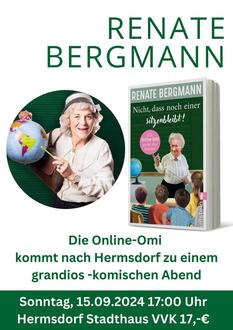 Die legendäre Online-Omi Renate Bergmann kommt am 15. September um 17 Uhr ins Stadthaus Hermsdorf. Mit ihrem Programm “Nicht, dass noch einer sitzenbleibt!” wird sie uns humorvoll und mit viel Charme erklären, wie Schule wirklich funktioniert. Und das, obwohl sie schon seit Jahrzehnten in Rente ist!