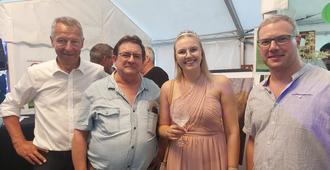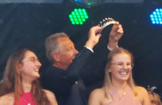 Wir waren stolze Ehrengäste. Gegen 18 Uhr eröffnete der Grünstadter Bürgermeister Klaus Wagner das Weinfest. In seiner Ansprache begrüßte er auch uns Hermsdorfer sehr herzlich. Wir winkten mit der Fahne und riefen zurück, sodass sofort eine prima Stimmung herrschte. Anschließend vollzog der Bürgermeister die „Abkrönung“ der 72. Weingräfin Charlotte I. und krönte die 73. Weingräfin des Leiningerlandes Sarah.I. indem er der neuen ihr Krönchen aufsetzte.