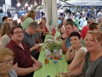 Um 17:30 Uhr trafen sich alle mitgereisten Mitglieder des Vereins. Gemeinsam liefen wir in das riesige Festzelt ein, wo 8 Weingüter ihre Weine präsentierten und verkauften. Die von uns mitgebrachte Hermsdorfer Fahne wurde geschwenkt und alle nahmen ihre Plätze, an den reservierten Tischen, ein.