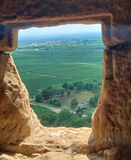 Bereits um 11 Uhr waren wir hoch oben auf der Burg Battenberg und genossen den herrlichen Ausblick über das Leiningerland, die Rheinebene, sowie den Odenwald bei schönstem Sonnenschein. Charlotte I. erzählte einiges über die Burg und die Möglichkeit hier Urlaub zu verbringen. Das ist sicher großartig dort für ein paar Tage besonders zur Weinlese im Herbst. Wir sahen von oben Weinbau in alle Richtungen.