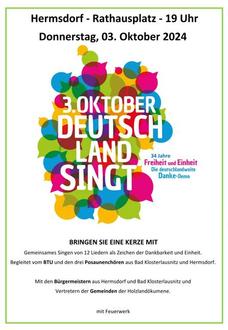 Auch in diesem Jahr soll am 3. Oktober wieder gemeinsam gesungen werden. Als Zeichen der Einheit und Dankbarkeit wird an dem Tag deutschlandweit zur großen DANKE-Demo eingeladen. So musizieren am 3. Oktober um 19 Uhr auf dem Hermsdorfer Rathausplatz das BTU und die 3 Posaunenchöre gemeinsam. Für die Besucher werden Liedtexte verteilt, so dass jeder die altvertrauten Lieder mitsingen kann. Die Gäste sind auch eingeladen, eine Kerze mitzubringen. Moderationen wird es von den Bürgermeistern, den Vertretern der Gemeinden der Holzlandökumene und Politikern geben, sagt Every Zabel, der Initiator dieser Veranstaltung. Für die Besucher stehen Bänke bereit, so dass jeder der möchte, die Stunde auch sitzend verbringen kann. Der hintere Teil des Platzes wird als Parkplatz genutzt, um allen einen kurzen Weg zu ermöglichen. Als Überraschung wird es in diesem Jahr wieder ein Feuerwerk geben.
