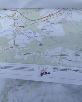 Nachdem dazu von jedem Maschinisten der aufgebaute Parcours gemeistert wurde, ging es weiter zur dritten und letzten Ausbildungseinheit für diesen Tag, die Orientierungs- und Geländefahrt. Dabei haben alle Teams ein selbsterarbeitetes Roadbook erhalten, in diesem waren verschiedene Kartenausschnitte mit 6 Zielpunkten vorgegeben, sowie an einzelnen markanten Stellen, Wegpunkte eingetragen. Ziel war es nun für die Teilnehmer, nur anhand der Karten sich einen Streckenverlauf zu überlegen, um die einzelnen Zielpunkte, die ausnahmslos alle auf Forstwegen lagen zu finden. So musste insgesamt eine Strecke von ca 105km von Eisenberg, über Graitschen bei Bürgel, das Langethal, Ruttersdorf, Tissa, Kleinebersdorf und Schleifreisen bis zurück nach Hermsdorf über größtenteils Wald-, Feld- und Forstwege zurückgelegt werden.
