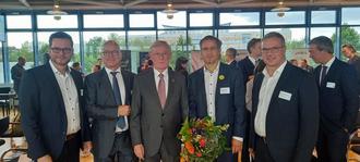 (v.l.n.r.): Geschäftsführer Dr. Knuth Baumgärtel (Micro-Hybrid Electronik GmbH), IHK-Hauptgeschäftsführer Peter Höhne, Schirmherr Bundespräsident a. D. Prof. Dr. Horst Köhler, Geschäftsführer Daniel Stötzner (LCP Laser Cut Processing GmbH) und Benny Hofmann (Bürgermeister Stadt Hermsdorf und 1. Beigeordneter SHK)