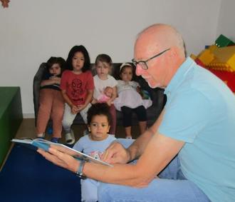 Seit Ende April 2025 freuen wir uns über einen Lesepaten in unserem Kinderhaus Bettingen. Herr Jürgen Salina ist pensionierter Beamter und macht diese Patenschaft ehrenamtlich. Einmal in der Woche kommt Jürgen in die Schäfchengruppe und liest spannende Geschichten und liebevoll ausgewählte Bilderbücher vor. Ob „Zilly die Zauberin" oder „die kleine Hexe" - in Kleingruppen wird interessierten Kindern vorgelesen und die Geschichte besprochen. Mit viel Engagement und Herzlichkeit ist Jürgen mit den Kindern im Kontakt und Austausch.