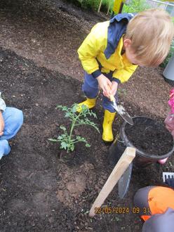 Im Beet gibt es bereits Erdbeeren, Stachelbeeren, Kirschen, Rhabarber und verschiedene Kräuter (Dill, Minze, Rosmarin, Thymian) und auch zwei Insektenhotels. Gemeinsam haben die Kinder mit der Gärtnerin noch Tomatenpflanzen, Wassermelone, Erdbeeren und Sonnenblumen gepflanzt. Damit diese wachsen und auch irgendwann geerntet werden können, brauchen sie gute Pflege, Wasser und Sonne.