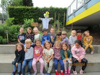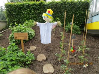 Darüber hinaus haben die Kinder sich überlegt, dass der Garten Schutz braucht, damit alles gut gedeihen kann. Sie haben kreativ und eigenständig eine Vogelscheuche gebastelt, die sogleich ihren Platz in unserem Naschgarten gefunden hat.