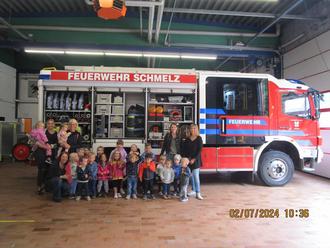 Am 02. Juli besuchten die Kinder der “Drachenbande", der "Schlossgespenster" und der "Fledermausgruppe” aufgeregt und voller Vorfreude die Feuerwache des Löschbezirks Schmelz. An der Feuerwache angekommen, wurden die Kinder herzlich von den Feuerwehrmännern empfangen.